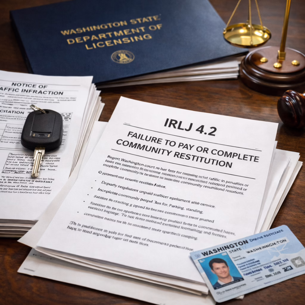 IRLJ 4.2 is a court rule within the Infraction Rules for Courts of Limited Jurisdiction that governs what happens when a person fails to pay a traffic infraction or fails to complete court-ordered community restitution.